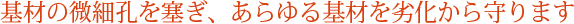 亜鉛メッキ、鋼材、コンクリート、石、木材などどのような基材にも浸透し、その孔を完全に塞ぎます。水やガスの侵入をシャットアウト、基材を劣化から長期にわたって守ります。