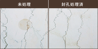 通常の含侵材の場合長時間そこに水(液体)があると染み込み始め色付き水(液体)の場合そこにシミとして残ります。スターシャインの場合、細孔を完全に塞いでいるため、水(液体)は内部に浸透せず濡れ色やシミを作りません。